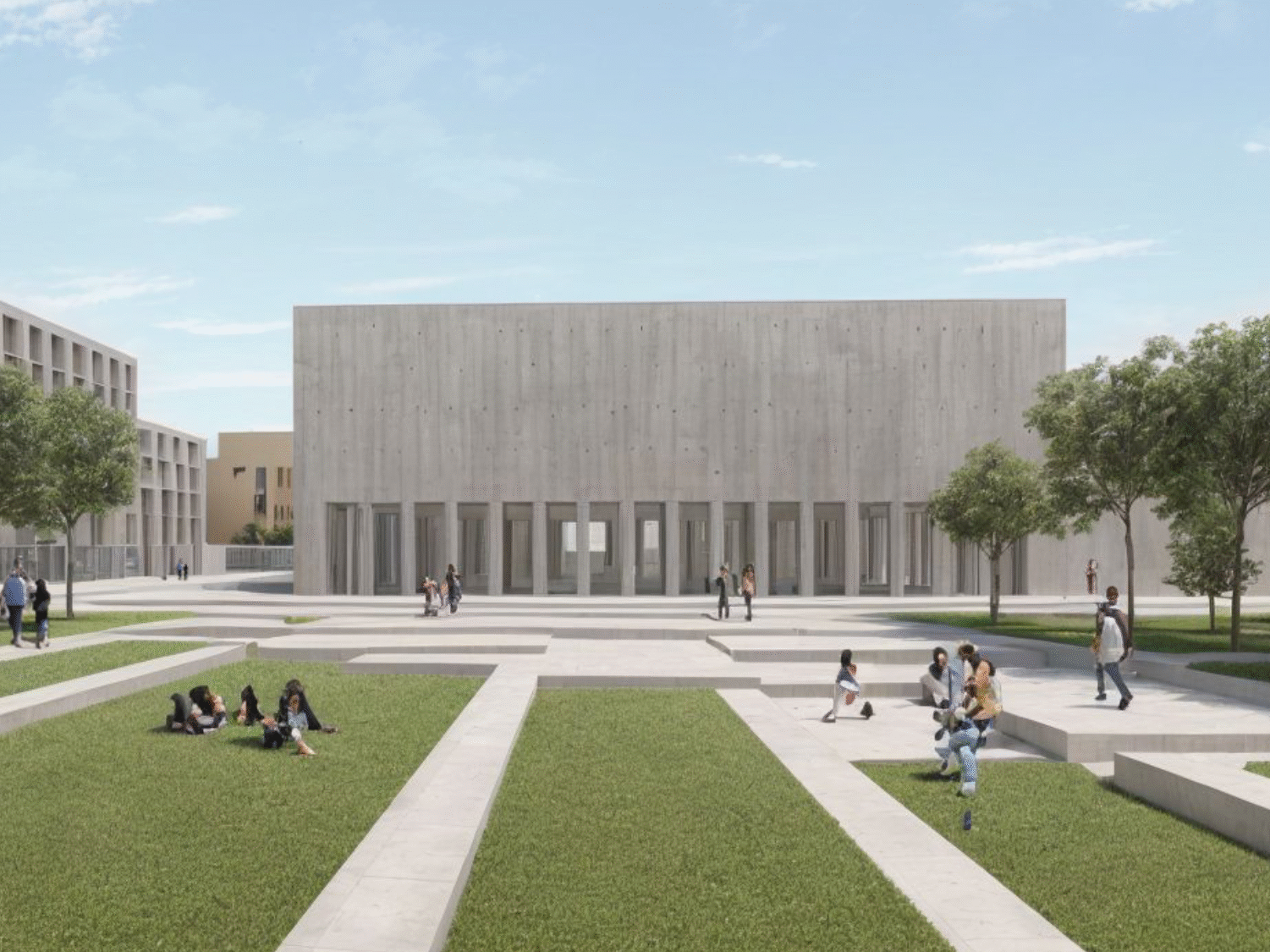 Fruit d’une collaboration enrichissante avec Ercan Karaer, ce projet multiplie les regards pour répondre aux enjeux contemporains. Les bâtiments s’ouvrent largement sur les espaces plantés, accentuant la relation entre intérieur et extérieur. La finesse des poteaux – droits ou obliques – soutient une skyline dynamique, animée par des retraits progressifs et un jeu de pleins et de vides en couronnement des immeubles collectifs. Les arbres fruitiers, disséminés dans les jardins, renforcent cette fluidité, tandis que les matériaux comme le blanc teinté dans la masse exploitent l’effet albédo pour réfléchir la lumière solaire et prévenir la surchauffe estivale.